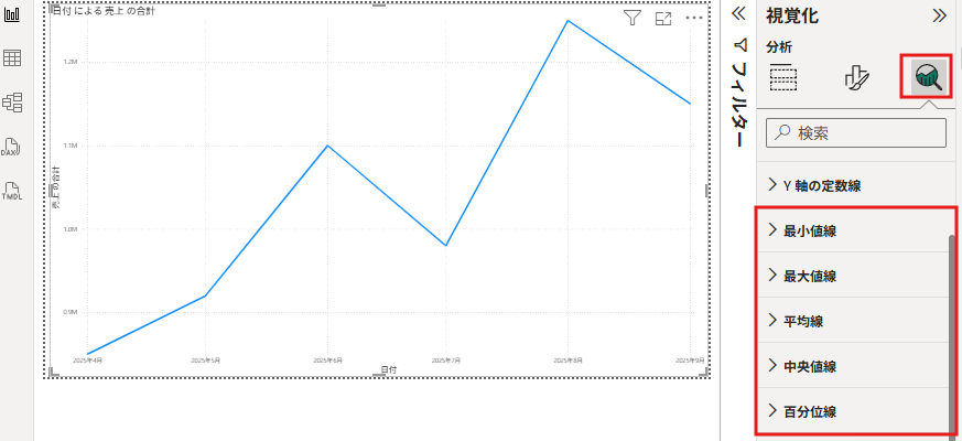 PowerBIでは定数線の追加以外にも平均値線・最大値線・最小値線・中央値線・百分位線のなどの横線の追加も簡単に行うことができます。
