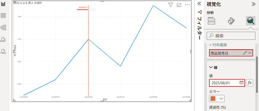 次に線を設定します。ここでは値に商品発売日の2025/6/1を入力します。