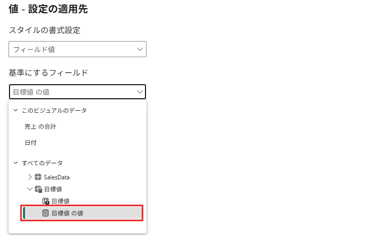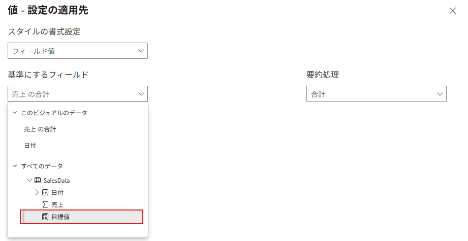 定数線の値の設定画面で「基準にするフィールド」で先ほど作成した変数「目標値」を選択します。