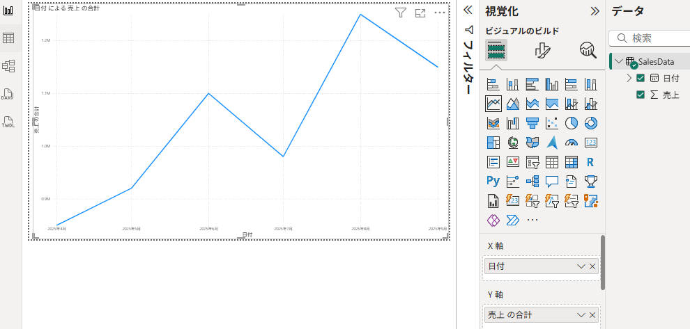 まず日付データと売上データを用いて折れ線グラフを作成します。