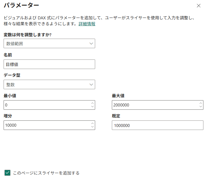 ここでは目標値を0~200万の間で10000間隔で変更できるように設定します。デフォルトの値は100万。