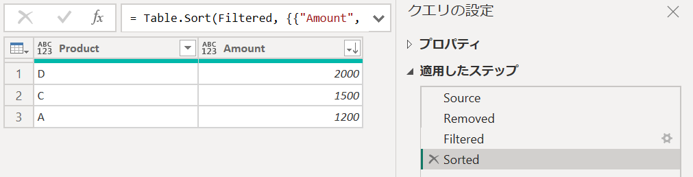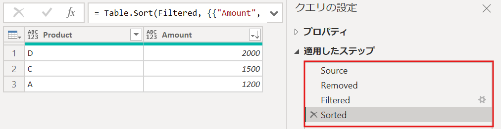 Sorted各処理ごとステップがあるため、処理の流れは分かりやすいですがPowerQuery上のステップは多くなります。