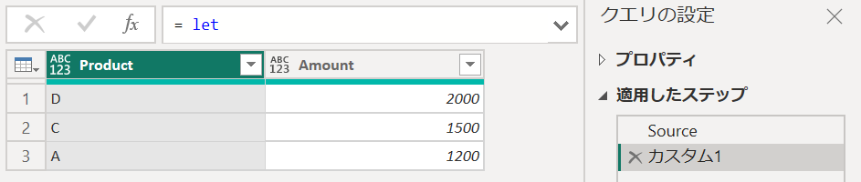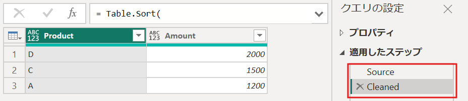 Source:テーブルを作成Cleaned:Table.RemobeColumns関数でSourceデータから列を削除、次にTable.SelectRows関数でフィルタをかけ、最後にTable.Sort関数でデータの並べ替えを実施let ... in:外側のletは全体の処理をまとめる