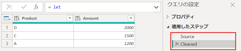 Source:テーブルを作成Cleaned:ステップの中でletを使い、3つの処理部をまとめて処理let ... in:外側のletは全体の流れを管理し、Cleanedの内側のletは部分処理を整理