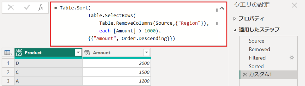 Sorted = Table.Sort(Filtered, {{"Amount", Order.Descending}})